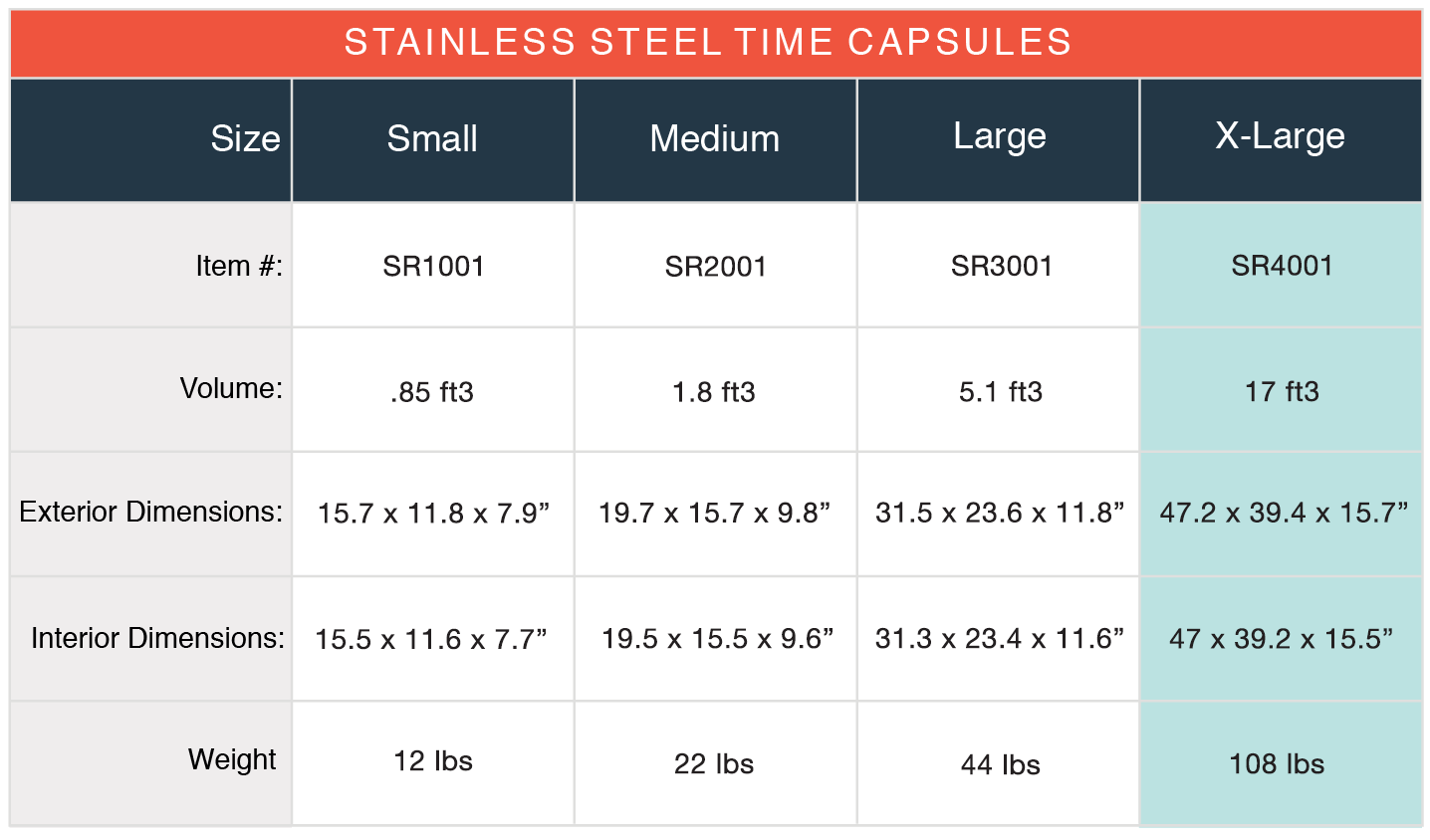 Our largest offering, the X-Large Heritage Time Capsule Stainless Steel Series Rectangle is a beautiful Capsule that can be displayed or buried in the ground. This is a standalone unit (no vault required).